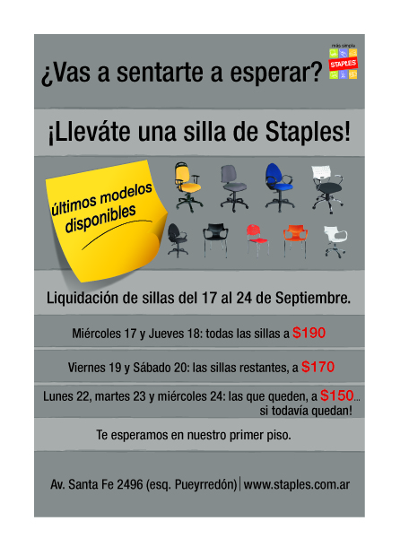 Por un exceso de stock, la semana pasada hicimos una oferta de sillas con un espíritu bastante parecido a Caída Libre. Empezamos la comunicación de la acción mediante volantes impresos el lunes pasado. Llevamos 9 modelos de sillas diferentes, todos con diferente cantidad (algunas había 5 unidades, otras 3 y otras 1) y les pusimos un único precio de $ 190 (unos U$S 65), que baja en $ 20 cada 2 días. Cada vez que una se vende, reducimos el stock de cada silla y cada vez que el precio cae, lo reducimos.