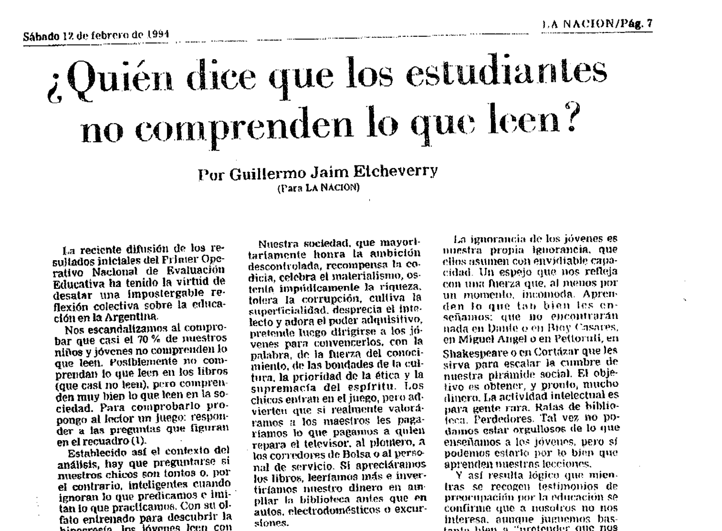 El artículo, publicado en el diario La Nación el 12 de Febrero de 1994, había sido escrito días después de que se dieran a conocer los resultados de un estudio sobre el nivel de la educación en la Argentina y muchos se «rasgaban las vestiduras», criticando cómo era posible que los jóvenes argentinos obtuvieran resultados tan malos en un test de comprensión de lectura. «Los estudiantes no comprenden lo que leen», titularon muchos. Y aquí va la imperdible respuesta de Guillermo Jaim Etcheverry: