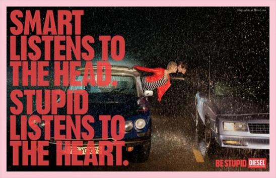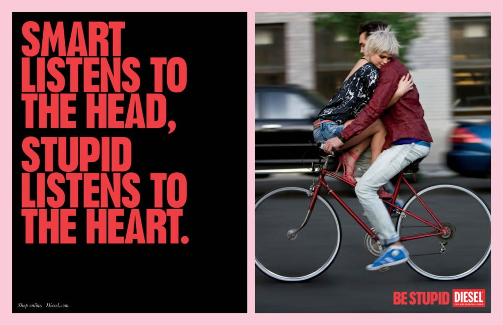 Diesel arranca su catálogo con la siguiente frase: «Stupid is the relentless pursuit of a regret-free life» («La estupidez es la incansable búsqueda de una vida sin arrepentimientos». Si no fuera porque pretende ser una definición de «Estúpido», esa es una frase que me encanta y define muy bien qué significa arriesgar y salir de la zona de comfort. Pero no hay nada que requiera más inteligencia, escuchar a la cabeza y planificar que decidir cuándo es el momento y cuál la manera correcta de arriesgar. Estoy seguro que, si las escenas que muestran los avisos fueran reales, la mayoría de los protagonistas terminarían totalmente arrepentidos de haberse subido a la bicicleta, haberse dado el beso de auto a auto, haberse acercado sin precauciones a un león o haber sido descuidados y descubiertos en una infidelidad.