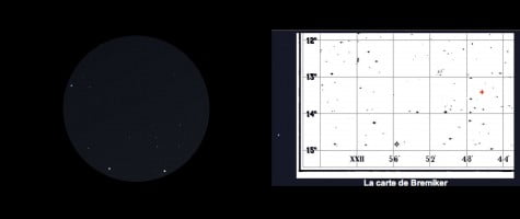La siguiente imágen muestra una simulación de la vista del telescopio desde Berlin el día del descubrimiento de Neptuno y el mapa astronómico indicando en rojo la predicción realizada por Le Verrier. El desafío consiste en encontrar al verdadero Neptuno intentando hacer la correspondencia entre las estrellas que se ven en la vista simulada y el mapa.