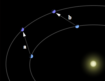 Orbitando en sentido horario en el punto "A" el planeta exterior "tira" del planeta interior (Urano) acelerando su órbita. En el punto "B" el planeta exterior frena al planeta interior haciendo su órbita mas lenta. (Fuente: Wikimedia)